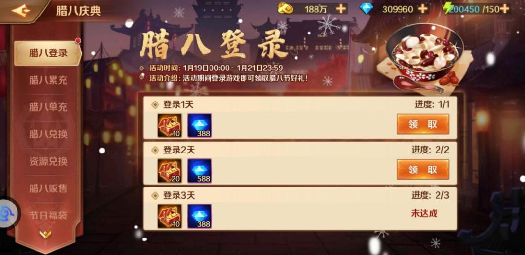 《新斗罗大陆》腊八专场活动抢先看 小孩小孩你别馋,过了腊八就是年!过腊八意味着拉开了新年的序幕。 腊八到了,本期6天的节日专场活动,我们为各位魂师大人准备了充足的福利,快和小舞一起来看看新年序章活动都有哪些精彩吧~ 腊八登录 活动期间,每日登录游戏,即可获得钻石以及腊八食盒。腊八当日,钻石和食盒的数量会更多哦! 活动时间:1月19日-1月21日 腊八兑换—超值节日专场活动 腊八红豆粥是腊八节日家家