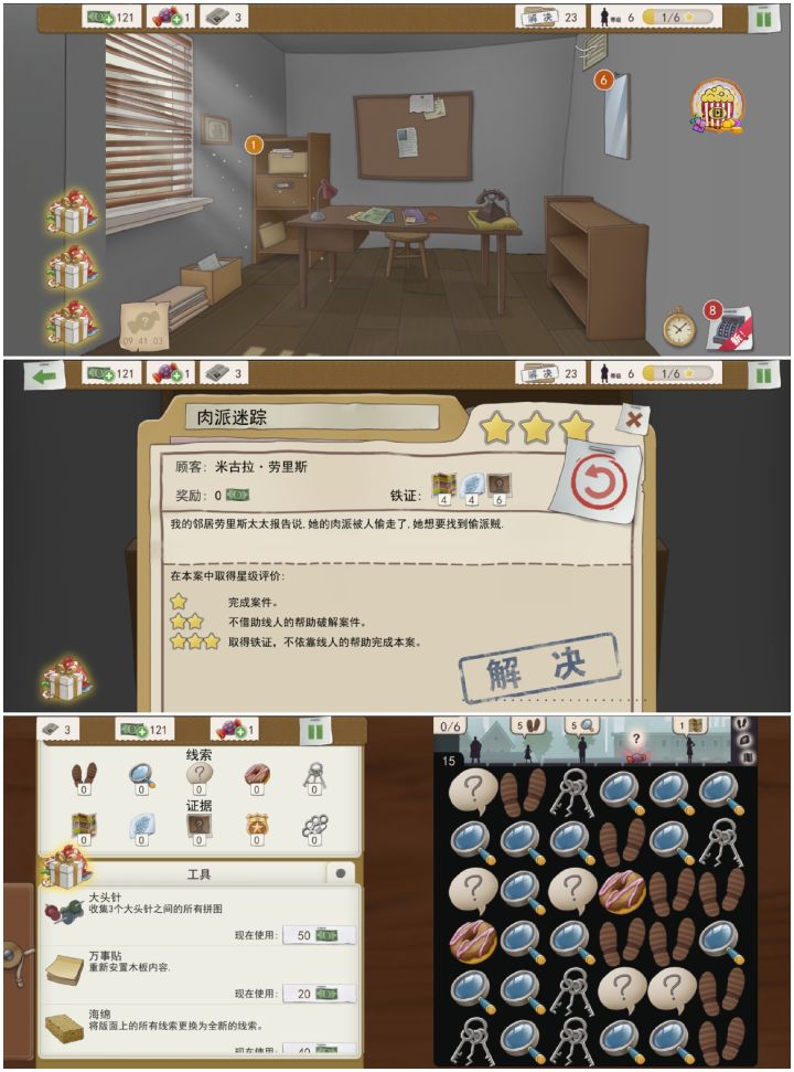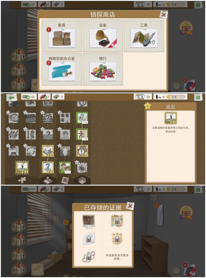 游戏体量轻,单个剧情案件需要5-15mins,剧情案件需要通过日常小任务(8-10个单个的益智游戏)积攒名声(报纸)解锁,后续对线索素材收集的要求会高很多,但侦探可以通过给办公室购入证物箱,书柜,办公桌或通过破案收集经验点满侦探的技能树来减少难度,实在不行可以使用糖果或货币来购买探案物资。