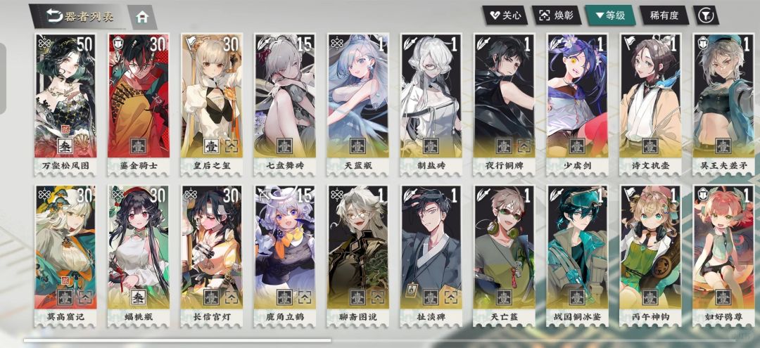 稍微讲述一下对器者的认知: (绿色不过多赘述,牢玩家的坚持罢了) 莫高窟记:回合均10万+ ,减CD ,限定 就这三条有什么理由不练 铜壶滴漏: 回能,该有的正面效果一个没少debuff也没落下 ,限定 就这三条有什么理由不练 莫高窟220 :多动症, 进可攻退可守,有控制能输出 就这三条有什么理由不练 T形帛画: 谷雨的终点, 肉龟 , 两次就不行的鸟 最初的标杆,家具的时候稍微崛起,