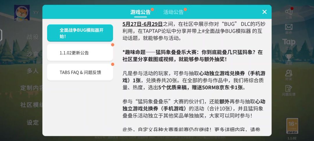 距离我们的“免费限时试玩部分章节”的活动还有2天,有点激动,以至于开始手抖了,(〃>皿<) 顺便说一下,试玩版本可以下载的时候,已经预约游戏的朋友会收到TAPTAP的站内信,所以不要忘记提前预约游戏! #xd独立游戏 #steam游戏 #tabs #全面憨憨战争模拟器 #全面战争模拟器