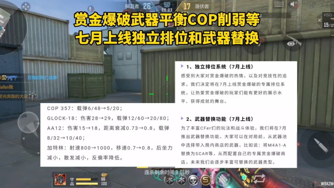 赏金爆破武器平衡COP削弱等,七月上线独立排位和武器替换!