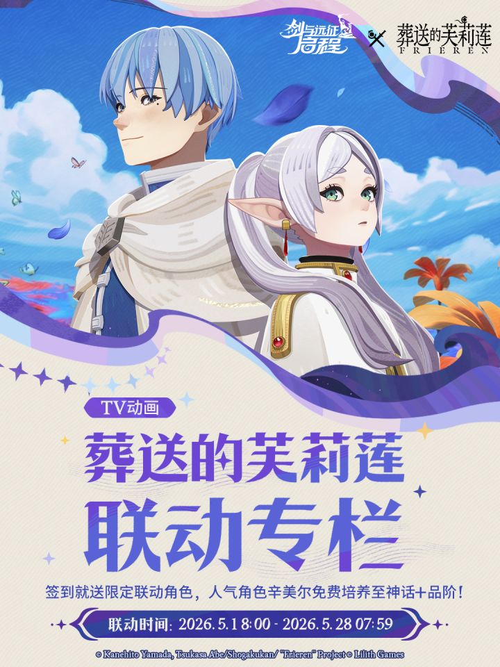 穿梭于讨伐魔王漫征途途上的魔法使芙莉莲,与勇者辛美尔,竟在一次时空乱流中,无意间被传送到了伊索米亚大陆。 新的冒险征程,亦是新篇的序章。 一切答案,尽在联动PV中揭晓。 《剑与远征:启程》×TV动画《葬送的芙莉莲》,将于5月1日正式开启! #葬送的芙莉莲 #剑与远征启程 #芙莉莲启程联动