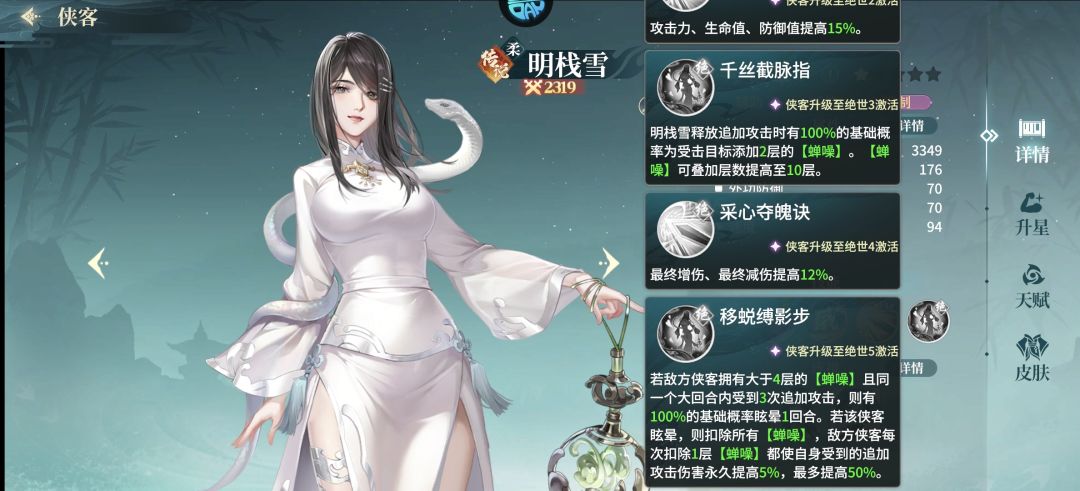 区服w340+游戏id95815865364185467 推荐侠客:薄雁君,司徒,上官/叶曼色,绮鸢,苏合熏。(也可下掉苏合熏,让叶和上官都上场力求短回合内结束战斗) 推荐秘籍:四件套薄带片血(平民可以换通天),司徒带八荒,其余全带万桑;二件套奶妈带洗髓,其他全带无相刀境。 推荐阵法:薄站阵眼,有满星山阵带山阵,没有就带火阵。 推荐器魂:藏锋,苍涛,万劫/离垢(敌方开局很快释放大招可以优先