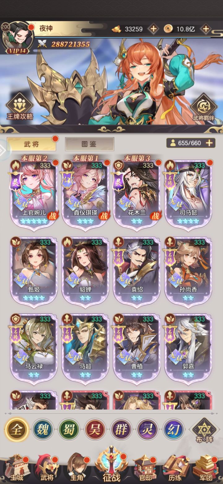 零氪应该怎么玩?玩哪些卡?首先最重要的就是屯元宝,循环活动每一次拉满基本都需要一万出头的元宝,合区活动一次更是需要五六万,想要多点甚至需要十万,然后就是压战力,布阵最多上2-3张卡,零氪合区前单将能到一千万,因为合区有战力冲榜活动,需要压战力冲榜拿红色自选或随机藏品。然后玩哪些卡,零氪低氪中氪都需要养甄姬(双无敌盾,二人转必备),然后就是输出,魏国司马懿,蜀国黄忠目前强势,马超甄姬可转灵(氪佬考虑),吴国陆逊,吕蒙太牢了,建议后期(一年以上)再补吕蒙,群雄袁绍,贾诩(布阵华佗更适合配队,甄姬可放二队)。循环活动以周为单位循环,需要屯招贤令100抽,祈福1000抽,神器升级35次,红颜宠幸20次。灵和幻轮流来,每个月来一个,所以灵将活动两月一次,幻将活动两月一次,灵可白嫖一个本体,幻可以屯抽数,都能白嫖,只是非常慢,皮肤活动必须抽满,抽一次送的积分可以拿去换灵将或者幻将碎片。