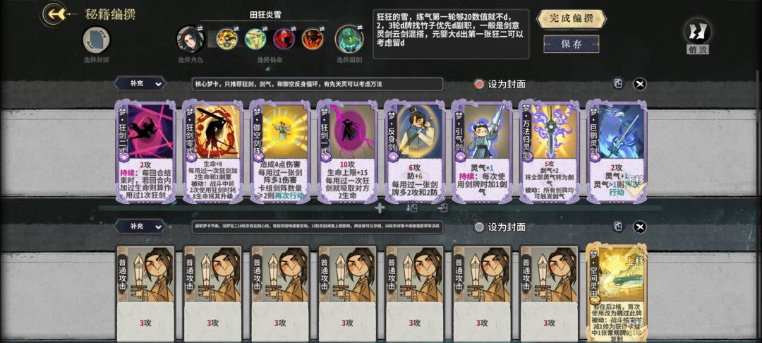 目录 一·前言 二·副职推荐 三·注意事项及换牌思路 四·道韵选择 五·仙命选择 六·共鸣选择 七·过渡思路(留牌推荐,摆牌推荐) 八·常见化神过渡摆法(非最终成型摆法) 九·化神成型摆法 十·结语 一·前言 李㵘,一个立绘不帅,被削弱后就人气平平的角色。背景故事中的李㵘,是一个以弱胜强的凡人高手。游戏里的李㵘也是如此,在凡躯的限制下,借助拆招对位和架势转换,以弱胜强。 许多道友