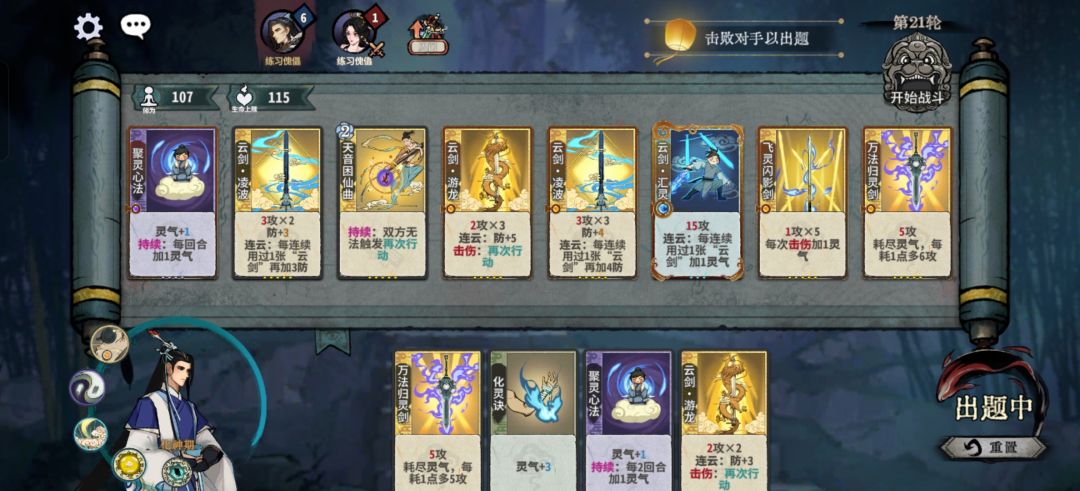 一、前言 符耀灵的秘籍码了忘记发了,所以这期新手攻略用耀灵糊弄一下,这期没有赛季机制,纯粹面向新手玩家。 二、机制简绍 卦:使随机数取最大值,概率取为1。 星位:该牌在星位上时触发后续效果。 后招:在第二次使用该卡时触发后续效果。 三、仙命介绍 因为耀灵数值过低的原因,并没有固定的最终卡组,所以这里把最终卡组放博弈里讲。 初始仙命,每突破一次扣一生命上限,抽一张该境界的牌,因为白板后招