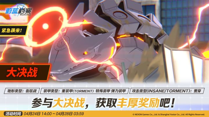 无限制决战"赛特之怒"即将开启,参与活动即可获得礼物选择盒、合成石、辅导手册及其他各类养成素材■ 活动时间• 赛季持续时间:04月23日 14:00 ~ 05月21日 03:59■ 首领"赛特的愤怒"的信息• 地形:野外战• 难度:分为124层共5个组别(1~24、25~49、50~74、75~99、100~124)• 防御类型:特殊装甲■ 参加条件• 通关任务(普通难度)5-1■