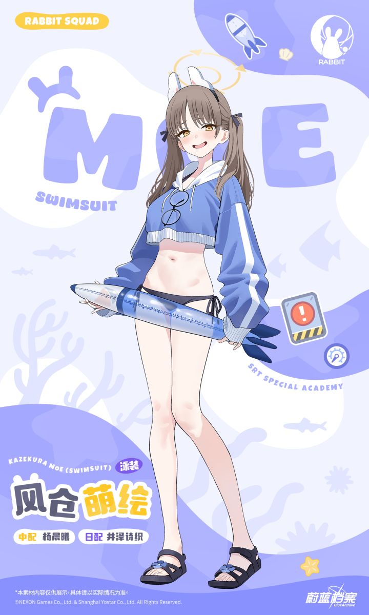 //////////档案启封//////////■ 萌绘(泳装)SRT特种学院所属,RABBIT小队通信员,为执行潜入任务暂时在偏远渔村驻扎。陌生的环境令她兴奋,因为可以在新的环境测试武器。与其他小队队员不同,她的泳衣设计大胆,而她的原话是,“这也是毁灭的一部分”。"这里是RABBIT 3。所以,什么时候可以发射导弹?"#蔚蓝档案