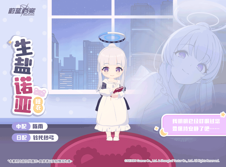 //////////档案启封//////////■ 诺亚(睡衣)千禧年科技学院理事会【研讨会】的秘书,为了享受安稳的休息换上了睡衣。平时淡于社交的秘书,休息日也总是安静的,但和研讨会成员们的相处时刻则是个例外。即使可爱的后辈与热情的发小不断产生误会,引发骚动,诺亚也只是默默地注视着这一切。带着微笑,记录着。“黑暗的底色是孤独……”#蔚蓝档案