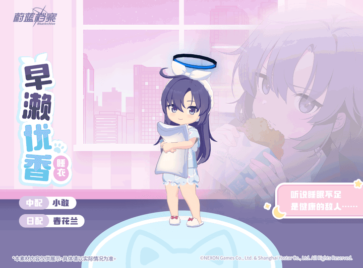 //////////档案启封//////////■ 优香(睡衣)千禧年科技学院理事会【研讨会】的会计,为了享受悠闲的休息而换上了睡衣。在工作上总是力求完美的她,却因为接连不断的状况而患上了失眠,于是经常无法顺着她的计划得到真正的休息。为了获得完美的睡眠,她准备了柔软的枕头和舒适的睡衣……但拜某位顽皮的夜猫子所赐,优质的睡眠还是那样遥不可及。“优秀的会计会将完美睡眠计划贯彻到底!”#蔚蓝档