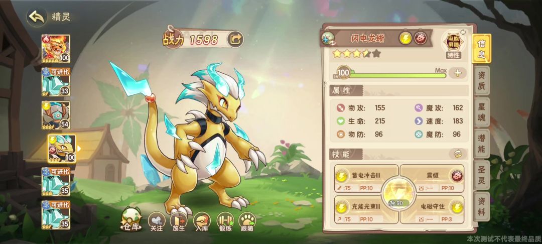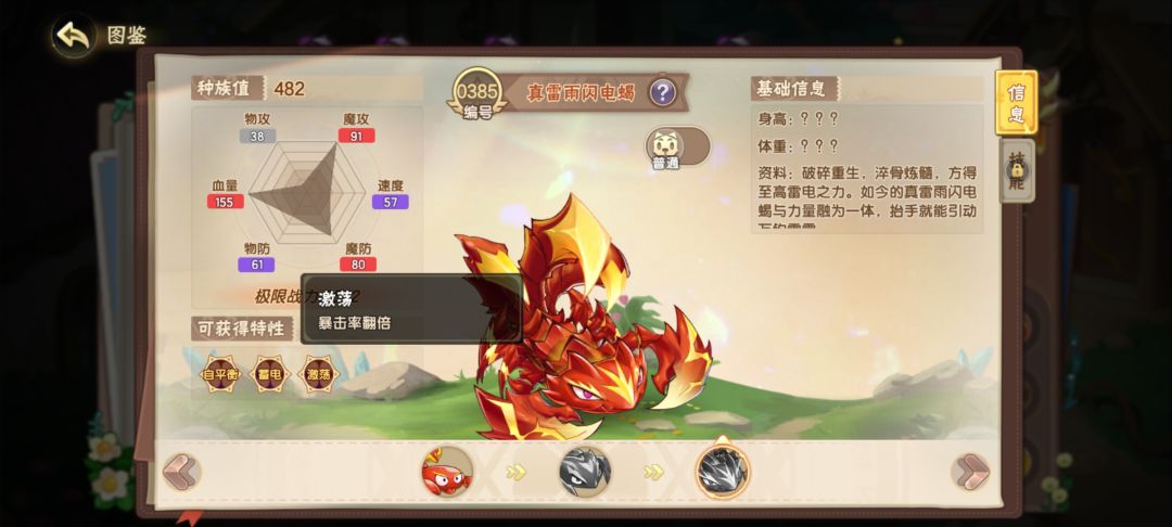这里说一下个人对闪电蝎pvp的理解,各位看完保证不走弯路! 首先是闪电蝎的种族值,高血高魔攻魔抗,和玲珑差不多。 再来是闪电蝎的特性,我只能说是一坨,不管是蓄电还是激荡实际上pvp都没什么用。有人说那我用蓄电抓狼王不行吗?首先你蝎子是魔抗高物抗低,其次速度慢,再来狼王打你蝎子为什么要用电系技能?请看最后一张图。 然后是激荡特性,暴击率翻倍,咋一看厉害哟,百分百暴击,配合100威力的技能那不是轻松拿