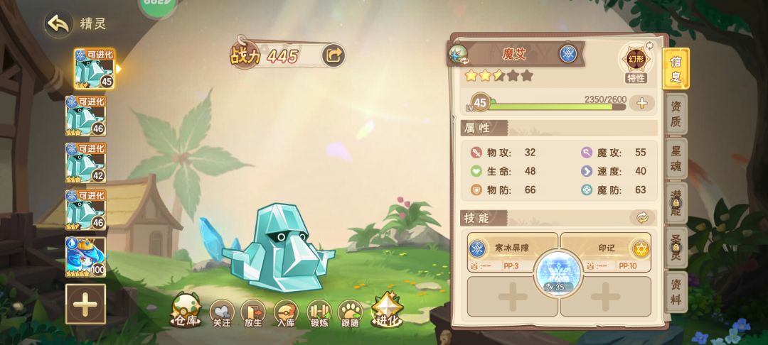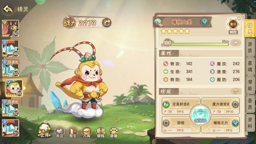 主流是老虎开局,楼主选的鹿,拿鹿的进化石时,用的蟠桃大圣加魔艾的组合! 然后楼主在想。这个组合打其他困难的boss可不可以呢?结果出乎意料的发现效果还不错! 由于老虎半血会锁血,这个没法秒。螳螂的话,三层星魂的魔攻刷满,潜能把有魔攻点几下,再强化下圣灵的好魔攻部件,也是有机会秒螳螂的! 收工回合次数,最多14回合!算上困难鹿,这组合能打五个困难boss! 先发猴子的数据信息,星魂是2层满,潜能没点
