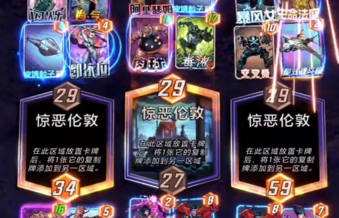 最优先放本视频的打法思路攻略: 注意:这是一套无脑自闭卡组,可以简单打出较大点数:6回合两地20~40点。。所以你一看对面点数能比你大的(王!黑豹凤凰毒液纳尔法庭银滑海拉大脑机等)?那你快撤就行了 本身点数较为扎实,赢多输少总会上分的 。 起源灵感:空、黑子/迷雾、铠、灵蝶&迷雾/电王、浩克(22点)、模仿大师(20点) 注:浩克只有上手时才有必要留能量,他在卡组时,你即便留能量也不会增益他 。 最