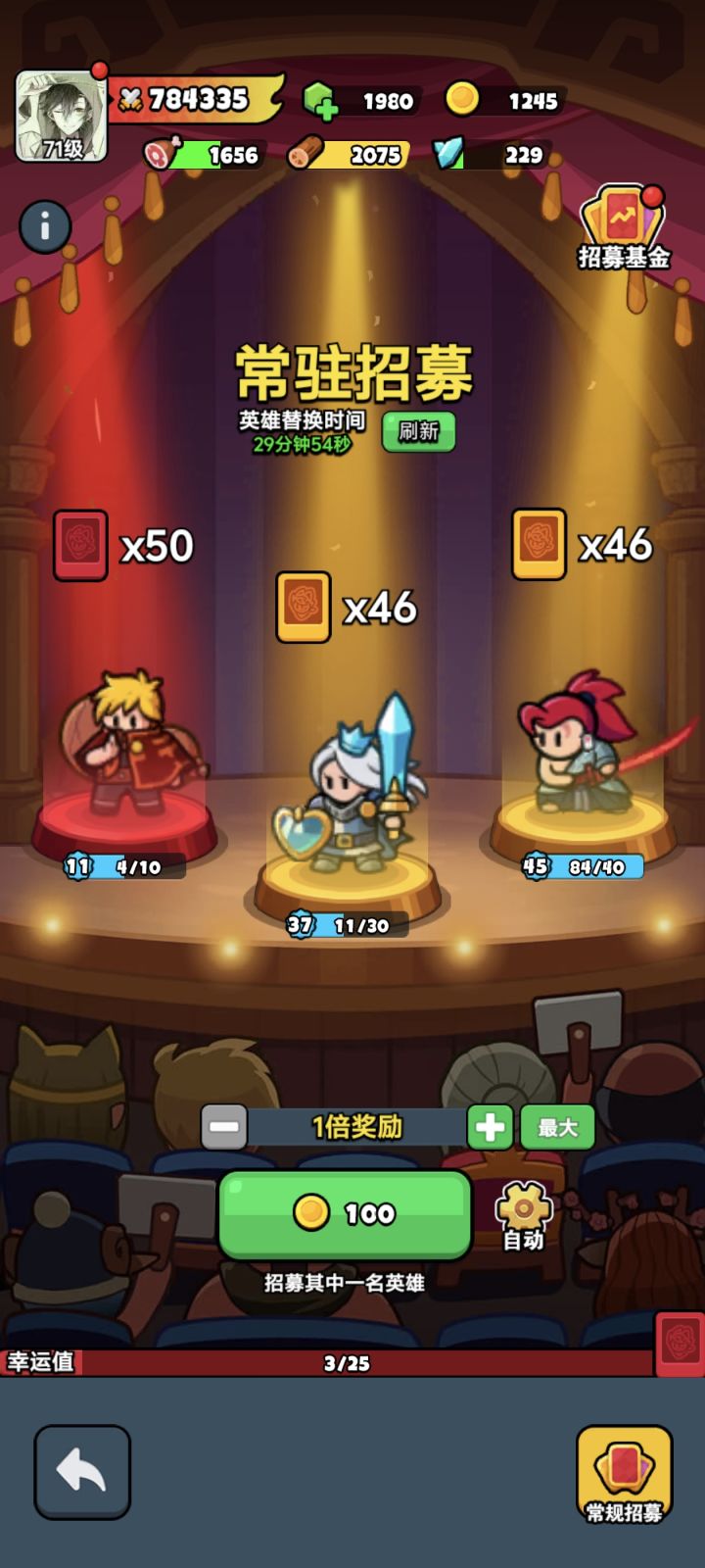 2.英雄碎片 金币的用途就是抽卡,100一次,抽的英雄碎片,英雄分蓝紫金红四个品级反正我体验下来就是随机三选一十次有八九次是会抽到最烂的那个,就是只有几个碎片的蓝卡,甚至白卡(白卡好像只有一个英雄,开始白给的)然后抽了碎片就该升级英雄了是吧