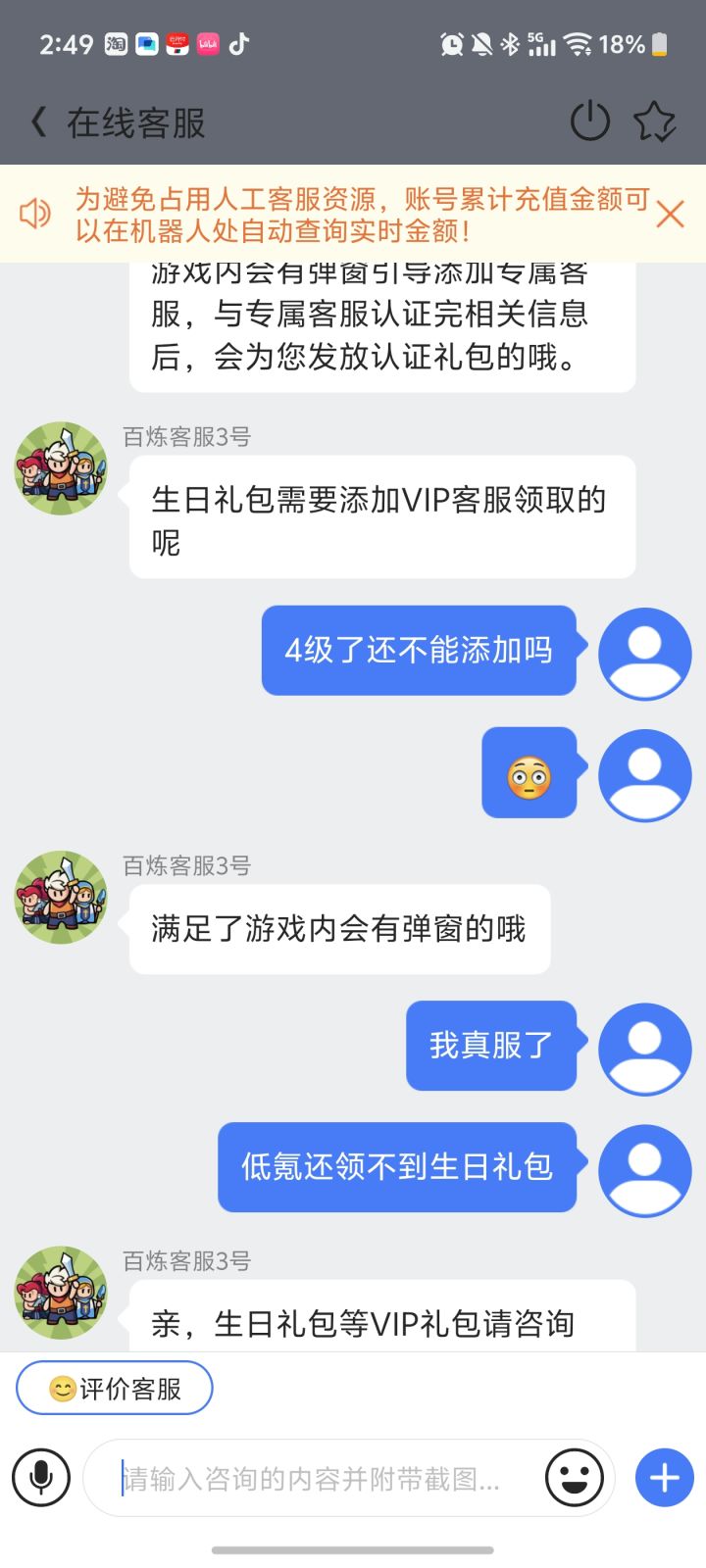 为什么退坑,因为了解到有个生日礼包,生日当天去找客服想领取,结果礼包要找专属客服领,专属客服要vip6才会有(当时vip4),这还是我去问的,早知道不问了找气受,哎