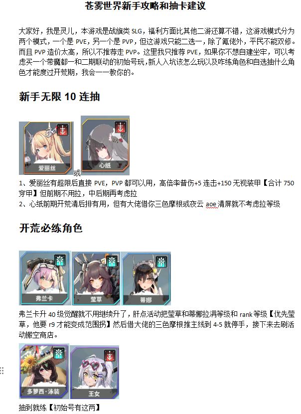 苍雾世界新手开荒阵容推荐 新手池拿心纸,泳装池子拿王女和多萝西各拿一名角色就行了,首充6元拿摩根推图强(有条件情况)两名泳装角色不推荐练,自选卡池就法尔奈斯(必选)、轸宿四或者娜斯佳、静、梅贝尔,蓝卡斯卡蒂也可以用,角色可以不用抽满命后面会有万能碎片可以直接弄满命,抽奖券要留着后面有人权卡。#苍雾世界