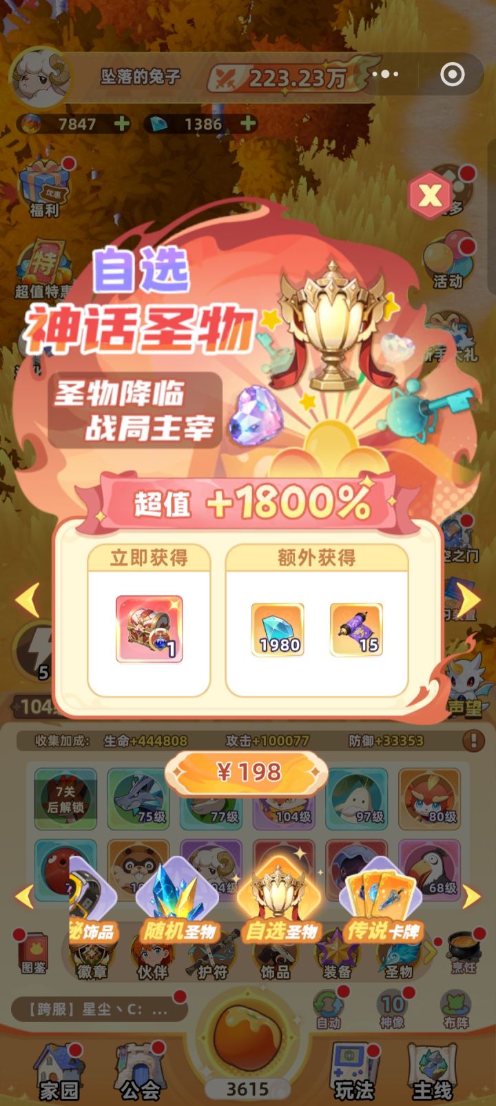 这个游戏我玩微信小程序玩过很久 作为一个氪金接近两万左右的玩家建议大家不要充值玩这个游戏 这个游戏宠物很少是一个缺点 2.这个游戏后期所有宠物都能闪光 一只闪光宠物要一千块 一只闪光神兽要两千块 得到神兽的方法要抽奖几乎次次保底而且不花钱得不到 钻石购买力度高的吓人一个圣物抽奖券要200钻石就是20块钱 活动就前半个月有活动后面就断了 钻石根本不够花不要看一开始基金什么送东西挺多几天就没有了后面可能你连扫荡果子的钻石都没有 3.你们有没有见过这样一种反方向更新的游戏 游戏策划为了让玩家花钱把所有免费资源减了 看下面两张图片搞笑的是礼包老区的价格便宜新区价格贵 能不玩建议不要玩