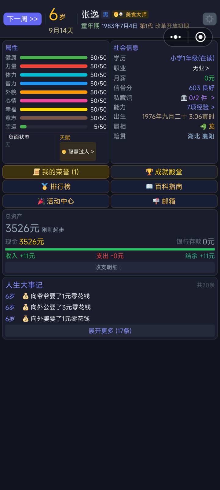 大家好,我是《大有可为:从零开始》的独立开发者。一个人,一个半月,从第一行代码到现在,终于把这个游戏做出来了。这是一款什么样的游戏?简单说:你在手机里重新活一次。从婴儿出生,到上学、工作、赚钱、买房、买车、收藏文物、成家立业,最后把财产传给下一代。每一周是一个回合,点击“下一周”推进时间。没有强制氪金,没有抽卡,没有满屏的充值入口。就是安安静静地做选择,看事件,过自己的人生。它有什么不一