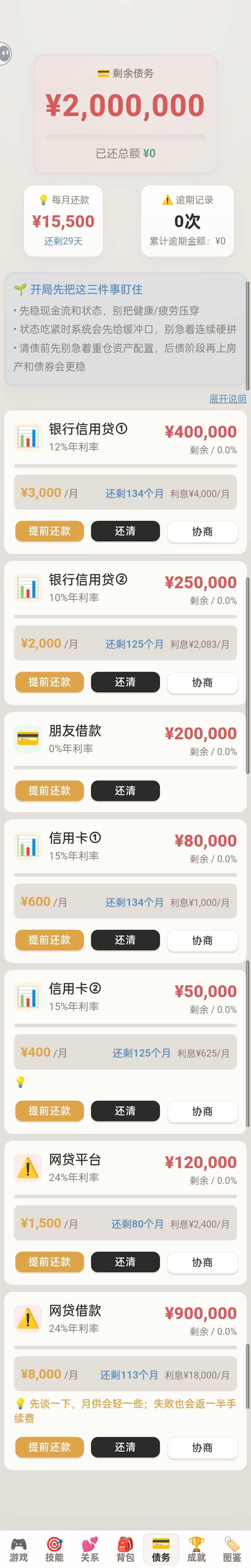 一天到晚反复工作,就为了还款。一开始我走了,不买道具的普通工作路线。一天只有几百块,然而利息一个月就有一万多点,每天还有支出。并且游戏里面还有家人支持,这仅是普通难度。