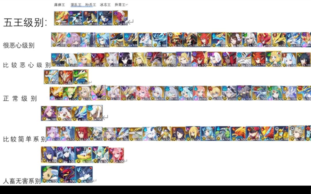 T0: 1.银河(装备修罗,特性光明祝福伤口) 2.乾坤(装备枪炮,特性猛兽复初) 3.梵天(装备天启,特性暗吸天启) 4.圣王麒麟(装备枪炮或金鬼,特性王吸雷电) 5.绘星若(装备天启,特性战斗治疗宇宙) T0.5: 1.羲和(装备天启,特性战斗治疗御日月) 2.奥丁(装备枪炮,特性猛兽至高) 3.01(装备天启,特性猛兽地藏) 4.132(装备金鬼或玫瑰,特性暗吸超暗之子) 5.共工(装备金鬼