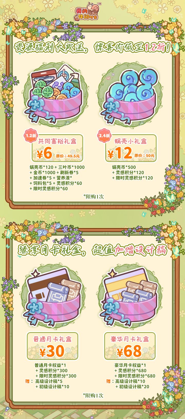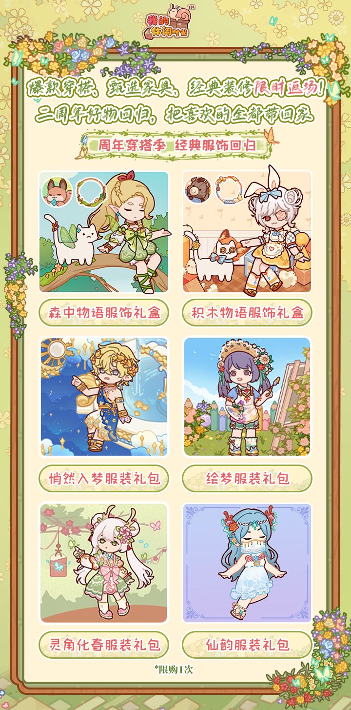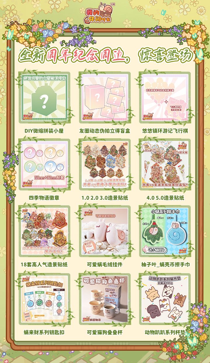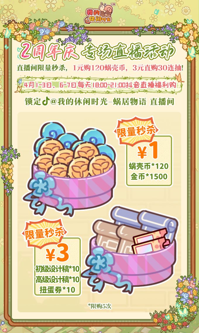 📢所有家蜗们来瞧一瞧、看一看啦!4月1-3日、6-7日每日下午18:00,锁定🎵dy@我的休闲时光-蜗居物语,超多惊喜礼包等你来解锁~ 🎉金片、奶茶券福利不定期掉落!直播期间,「特别纪念金片周边」、「周年庆周边礼盒」、「奶茶兑换券」惊喜福利将会随机掉落,超多好礼千万别错过! 🎁人气礼包限时返场!「森中物语」户外装修&套装、「积木物语」户外装修&套装等超多热门好礼即将上架,大家期待许久的「植树接