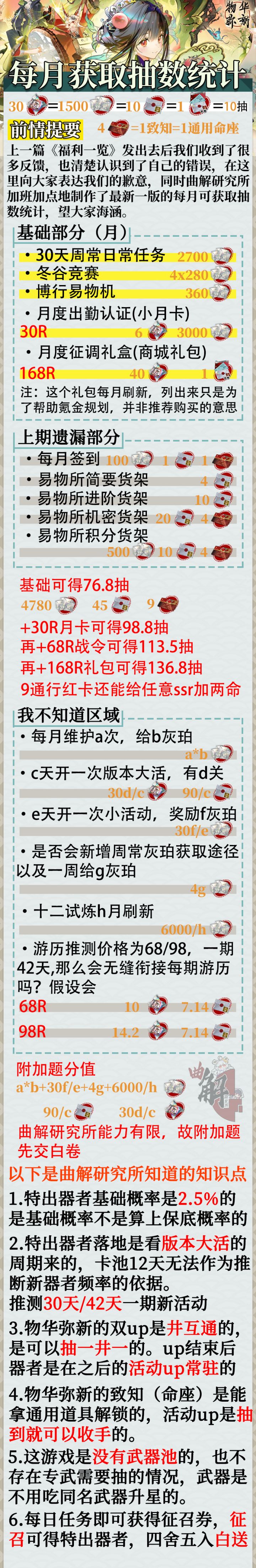 上一篇《福利一览》发出去后我们收到了很多反馈,也清楚认识到了自己的错误,在这里向大家诚挚表达我们的歉意,同时曲解研究所加班加点地制作了最新一版的每月可获取抽数统计,望大家海涵。