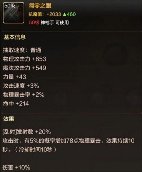 凋零之眼:差不多是漫游专属武器,效果是[乱射]发射数+20%;攻击时,有5%的概率增加78点物理暴击,效果持续10秒。(冷却时间10秒)、伤害+10%。