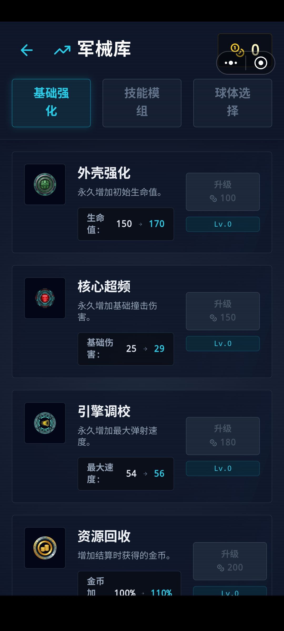 有外围养成,消耗游戏产出金币可进行基础能力、技能模组、球体选择的强化,每个强化分支下若干养成线,对金币资源需求量很大。前期基础能力提升较快,但数值有放大,提升速度逐步放缓,养成有阶段性。